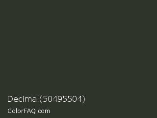 Decimal 50495504 Color is a very dark green color and the nearest color is Heavy Metal #2b3228. Hex code #2e342a and RGB value is rgb(46,52,42). In RGB color space, this color is composed of 18% red, 20% green, 16% blue, In CMYK color space, this color is composed of 12% cyan, 0% magenta, 19% yellow , 80% black , In HSL color space, this color has a hue angle of 96° , 11% saturation and 18% lightness.