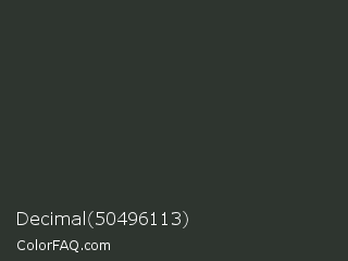 Decimal 50496113 Color is a very dark green color and the nearest color is Mine Shaft #323232. Hex code #2e352f and RGB value is rgb(46,53,47). In RGB color space, this color is composed of 18% red, 21% green, 18% blue, In CMYK color space, this color is composed of 13% cyan, 0% magenta, 11% yellow , 79% black , In HSL color space, this color has a hue angle of 129° , 7% saturation and 19% lightness.