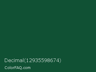 Decimal 12935598674 Color is a very dark green color and the nearest color is Brunswick Green #1b4d3e. Hex code #105134 and RGB value is rgb(16,81,52). In RGB color space, this color is composed of 6% red, 32% green, 20% blue, In CMYK color space, this color is composed of 80% cyan, 0% magenta, 36% yellow , 68% black , In HSL color space, this color has a hue angle of 153° , 67% saturation and 19% lightness.
