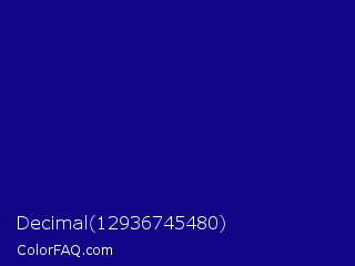 Decimal 12936745480 Color is a dark indigo color and the nearest color is Ultramarine #120a8f. Hex code #120688 and RGB value is rgb(18,6,136). In RGB color space, this color is composed of 7% red, 2% green, 53% blue, In CMYK color space, this color is composed of 87% cyan, 96% magenta, 0% yellow , 47% black , In HSL color space, this color has a hue angle of 246° , 92% saturation and 28% lightness.