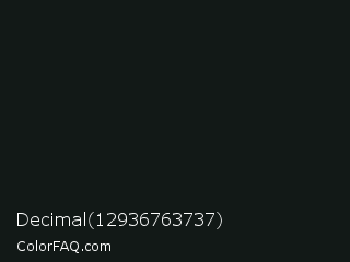 Decimal 12936763737 Color is a almost black green color and the nearest color is Aztec #0d1c19. Hex code #121917 and RGB value is rgb(18,25,23). In RGB color space, this color is composed of 7% red, 10% green, 9% blue, In CMYK color space, this color is composed of 28% cyan, 0% magenta, 8% yellow , 90% black , In HSL color space, this color has a hue angle of 163° , 16% saturation and 8% lightness.