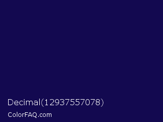 Decimal 12937557078 Color is a very dark indigo color and the nearest color is Tolopea #1b0245. Hex code #130950 and RGB value is rgb(19,9,80). In RGB color space, this color is composed of 7% red, 4% green, 31% blue, In CMYK color space, this color is composed of 76% cyan, 89% magenta, 0% yellow , 69% black , In HSL color space, this color has a hue angle of 248° , 80% saturation and 17% lightness.