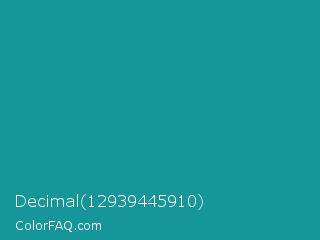 Decimal 12939445910 Color is a normal cyan color and the nearest color is Blue Chill #0c8990. Hex code #159698 and RGB value is rgb(21,150,152). In RGB color space, this color is composed of 8% red, 59% green, 60% blue, In CMYK color space, this color is composed of 86% cyan, 1% magenta, 0% yellow , 40% black , In HSL color space, this color has a hue angle of 181° , 76% saturation and 34% lightness.