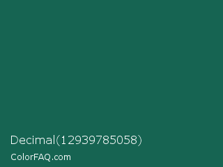 Decimal 12939785058 Color is a dark cyan color and the nearest color is Eden #105852. Hex code #166452 and RGB value is rgb(22,100,82). In RGB color space, this color is composed of 9% red, 39% green, 32% blue, In CMYK color space, this color is composed of 78% cyan, 0% magenta, 18% yellow , 61% black , In HSL color space, this color has a hue angle of 166° , 64% saturation and 24% lightness.