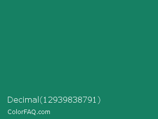 Decimal 12939838791 Color is a dark cyan color and the nearest color is Deep Green Cyan Turquoise #0e7c61. Hex code #168063 and RGB value is rgb(22,128,99). In RGB color space, this color is composed of 9% red, 50% green, 39% blue, In CMYK color space, this color is composed of 83% cyan, 0% magenta, 23% yellow , 50% black , In HSL color space, this color has a hue angle of 164° , 71% saturation and 29% lightness.