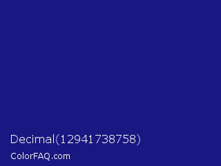 Decimal 12941738758 Color is a dark indigo color and the nearest color is Deep Koamaru #1b127b. Hex code #191782 and RGB value is rgb(25,23,130). In RGB color space, this color is composed of 10% red, 9% green, 51% blue, In CMYK color space, this color is composed of 81% cyan, 82% magenta, 0% yellow , 49% black , In HSL color space, this color has a hue angle of 241° , 70% saturation and 30% lightness.