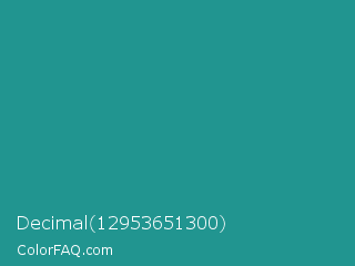 Decimal 12953651300 Color is a normal cyan color and the nearest color is Lochinvar #2c8c84. Hex code #219590 and RGB value is rgb(33,149,144). In RGB color space, this color is composed of 13% red, 58% green, 56% blue, In CMYK color space, this color is composed of 78% cyan, 0% magenta, 3% yellow , 42% black , In HSL color space, this color has a hue angle of 177° , 64% saturation and 36% lightness.