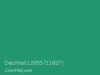 Decimal 12955711827 Color is a normal green color and the nearest color is Illuminating Emerald #319177. Hex code #249771 and RGB value is rgb(36,151,113). In RGB color space, this color is composed of 14% red, 59% green, 44% blue, In CMYK color space, this color is composed of 76% cyan, 0% magenta, 25% yellow , 41% black , In HSL color space, this color has a hue angle of 160° , 61% saturation and 37% lightness.