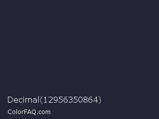 Decimal 12956350864 Color is a very dark indigo color and the nearest color is Steel Gray #262335. Hex code #252436 and RGB value is rgb(37,36,54). In RGB color space, this color is composed of 15% red, 14% green, 21% blue, In CMYK color space, this color is composed of 31% cyan, 33% magenta, 0% yellow , 79% black , In HSL color space, this color has a hue angle of 243° , 20% saturation and 18% lightness.