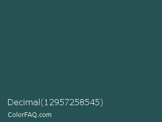 Decimal 12957258545 Color is a dark cyan color and the nearest color is Plantation #27504b. Hex code #265253 and RGB value is rgb(38,82,83). In RGB color space, this color is composed of 15% red, 32% green, 33% blue, In CMYK color space, this color is composed of 54% cyan, 1% magenta, 0% yellow , 67% black , In HSL color space, this color has a hue angle of 181° , 37% saturation and 24% lightness.