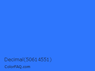 Decimal 50614551 Color is a normal blue color and the nearest color is Blue Crayola #1f75fe. Hex code #2e76fd and RGB value is rgb(46,118,253). In RGB color space, this color is composed of 18% red, 46% green, 99% blue, In CMYK color space, this color is composed of 82% cyan, 53% magenta, 0% yellow , 1% black , In HSL color space, this color has a hue angle of 219° , 98% saturation and 59% lightness.