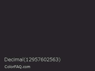 Decimal 12957602563 Color is a very dark magenta color and the nearest color is Shark #25272c. Hex code #272527 and RGB value is rgb(39,37,39). In RGB color space, this color is composed of 15% red, 15% green, 15% blue, In CMYK color space, this color is composed of 0% cyan, 5% magenta, 0% yellow , 85% black , In HSL color space, this color has a hue angle of 300° , 3% saturation and 15% lightness.