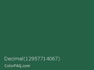 Decimal 12957714067 Color is a dark green color and the nearest color is Green Pea #1d6142. Hex code #276145 and RGB value is rgb(39,97,69). In RGB color space, this color is composed of 15% red, 38% green, 27% blue, In CMYK color space, this color is composed of 60% cyan, 0% magenta, 29% yellow , 62% black , In HSL color space, this color has a hue angle of 151° , 43% saturation and 27% lightness.