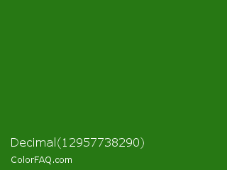 Decimal 12957738290 Color is a dark green color and the nearest color is Bilbao #327c14. Hex code #277814 and RGB value is rgb(39,120,20). In RGB color space, this color is composed of 15% red, 47% green, 8% blue, In CMYK color space, this color is composed of 68% cyan, 0% magenta, 83% yellow , 53% black , In HSL color space, this color has a hue angle of 109° , 71% saturation and 27% lightness.