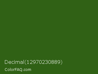 Decimal 12970230889 Color is a dark green color and the nearest color is Dell #396413. Hex code #306115 and RGB value is rgb(48,97,21). In RGB color space, this color is composed of 19% red, 38% green, 8% blue, In CMYK color space, this color is composed of 51% cyan, 0% magenta, 78% yellow , 62% black , In HSL color space, this color has a hue angle of 99° , 64% saturation and 23% lightness.