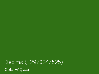 Decimal 12970247525 Color is a dark green color and the nearest color is Bilbao #327c14. Hex code #307115 and RGB value is rgb(48,113,21). In RGB color space, this color is composed of 19% red, 44% green, 8% blue, In CMYK color space, this color is composed of 58% cyan, 0% magenta, 81% yellow , 56% black , In HSL color space, this color has a hue angle of 102° , 69% saturation and 26% lightness.