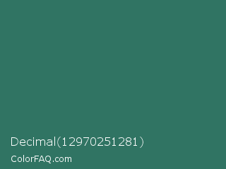 Decimal 12970251281 Color is a normal cyan color and the nearest color is Myrtle Green #317873. Hex code #307463 and RGB value is rgb(48,116,99). In RGB color space, this color is composed of 19% red, 45% green, 39% blue, In CMYK color space, this color is composed of 59% cyan, 0% magenta, 15% yellow , 55% black , In HSL color space, this color has a hue angle of 165° , 41% saturation and 32% lightness.