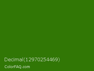 Decimal 12970254469 Color is a dark green color and the nearest color is Napier Green #2a8000. Hex code #307705 and RGB value is rgb(48,119,5). In RGB color space, this color is composed of 19% red, 47% green, 2% blue, In CMYK color space, this color is composed of 60% cyan, 0% magenta, 96% yellow , 53% black , In HSL color space, this color has a hue angle of 97° , 92% saturation and 24% lightness.