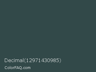 Decimal 12971430985 Color is a dark cyan color and the nearest color is Charcoal #36454f. Hex code #324949 and RGB value is rgb(50,73,73). In RGB color space, this color is composed of 20% red, 29% green, 29% blue, In CMYK color space, this color is composed of 32% cyan, 0% magenta, 0% yellow , 71% black , In HSL color space, this color has a hue angle of 180° , 19% saturation and 24% lightness.