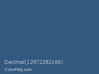 Decimal 12972282166 Color is a normal blue color and the nearest color is Chambray #354e8c. Hex code #335980 and RGB value is rgb(51,89,128). In RGB color space, this color is composed of 20% red, 35% green, 50% blue, In CMYK color space, this color is composed of 60% cyan, 30% magenta, 0% yellow , 50% black , In HSL color space, this color has a hue angle of 210° , 43% saturation and 35% lightness.