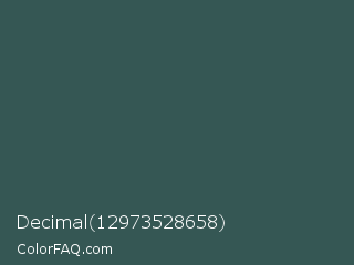 Decimal 12973528658 Color is a dark cyan color and the nearest color is Stromboli #325d52. Hex code #355754 and RGB value is rgb(53,87,84). In RGB color space, this color is composed of 21% red, 34% green, 33% blue, In CMYK color space, this color is composed of 39% cyan, 0% magenta, 3% yellow , 66% black , In HSL color space, this color has a hue angle of 175° , 24% saturation and 27% lightness.