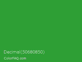 Decimal 50680850 Color is a normal green color and the nearest color is Wageningen Green #34b233. Hex code #2e9f34 and RGB value is rgb(46,159,52). In RGB color space, this color is composed of 18% red, 62% green, 20% blue, In CMYK color space, this color is composed of 71% cyan, 0% magenta, 67% yellow , 38% black , In HSL color space, this color has a hue angle of 123° , 55% saturation and 40% lightness.