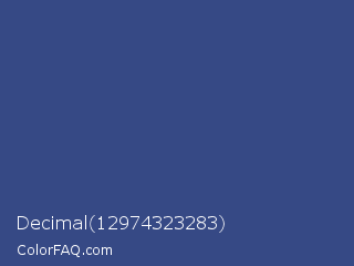 Decimal 12974323283 Color is a normal blue color and the nearest color is Chambray #354e8c. Hex code #364985 and RGB value is rgb(54,73,133). In RGB color space, this color is composed of 21% red, 29% green, 52% blue, In CMYK color space, this color is composed of 59% cyan, 45% magenta, 0% yellow , 48% black , In HSL color space, this color has a hue angle of 226° , 42% saturation and 37% lightness.