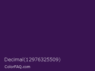 Decimal 12976325509 Color is a very dark purple color and the nearest color is Deep Grape #381a51. Hex code #391351 and RGB value is rgb(57,19,81). In RGB color space, this color is composed of 22% red, 7% green, 32% blue, In CMYK color space, this color is composed of 30% cyan, 77% magenta, 0% yellow , 68% black , In HSL color space, this color has a hue angle of 277° , 62% saturation and 20% lightness.