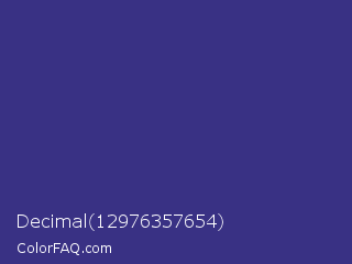 Decimal 12976357654 Color is a normal indigo color and the nearest color is Minsk #3f307f. Hex code #393184 and RGB value is rgb(57,49,132). In RGB color space, this color is composed of 22% red, 19% green, 52% blue, In CMYK color space, this color is composed of 57% cyan, 63% magenta, 0% yellow , 48% black , In HSL color space, this color has a hue angle of 246° , 46% saturation and 35% lightness.