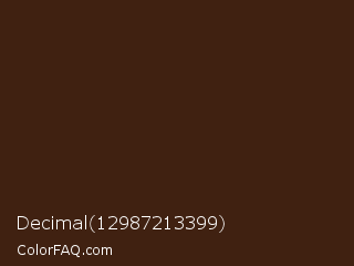Decimal 12987213399 Color is a very dark orange color and the nearest color is Deep Oak #412010. Hex code #402111 and RGB value is rgb(64,33,17). In RGB color space, this color is composed of 25% red, 13% green, 7% blue, In CMYK color space, this color is composed of 0% cyan, 48% magenta, 73% yellow , 75% black , In HSL color space, this color has a hue angle of 20° , 58% saturation and 16% lightness.