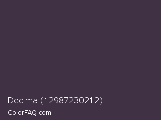 Decimal 12987230212 Color is a dark purple color and the nearest color is Ship Gray #3e3a44. Hex code #403144 and RGB value is rgb(64,49,68). In RGB color space, this color is composed of 25% red, 19% green, 27% blue, In CMYK color space, this color is composed of 6% cyan, 28% magenta, 0% yellow , 73% black , In HSL color space, this color has a hue angle of 287° , 16% saturation and 23% lightness.