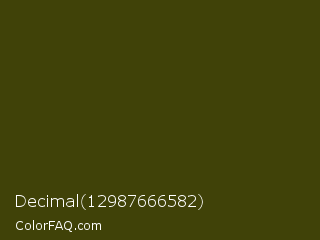 Decimal 12987666582 Color is a very dark yellow color and the nearest color is Camouflage #3c3910. Hex code #404208 and RGB value is rgb(64,66,8). In RGB color space, this color is composed of 25% red, 26% green, 3% blue, In CMYK color space, this color is composed of 3% cyan, 0% magenta, 88% yellow , 74% black , In HSL color space, this color has a hue angle of 62° , 78% saturation and 15% lightness.