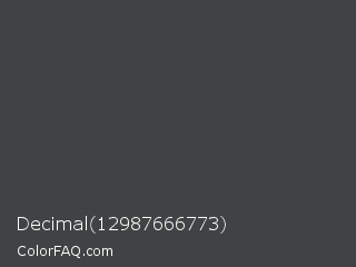 Decimal 12987666773 Color is a dark blue color and the nearest color is Cape Cod #3c4443. Hex code #404243 and RGB value is rgb(64,66,67). In RGB color space, this color is composed of 25% red, 26% green, 26% blue, In CMYK color space, this color is composed of 4% cyan, 1% magenta, 0% yellow , 74% black , In HSL color space, this color has a hue angle of 200° , 2% saturation and 26% lightness.