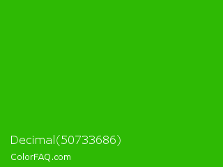 Decimal 50733686 Color is a normal green color and the nearest color is Kelly Green #4cbb17. Hex code #2eba04 and RGB value is rgb(46,186,4). In RGB color space, this color is composed of 18% red, 73% green, 2% blue, In CMYK color space, this color is composed of 75% cyan, 0% magenta, 98% yellow , 27% black , In HSL color space, this color has a hue angle of 106° , 96% saturation and 37% lightness.