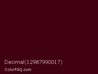 Decimal 12987990017 Color is a very dark red color and the nearest color is Temptress #3b000b. Hex code #410111 and RGB value is rgb(65,1,17). In RGB color space, this color is composed of 25% red, 0% green, 7% blue, In CMYK color space, this color is composed of 0% cyan, 98% magenta, 74% yellow , 75% black , In HSL color space, this color has a hue angle of 345° , 97% saturation and 13% lightness.