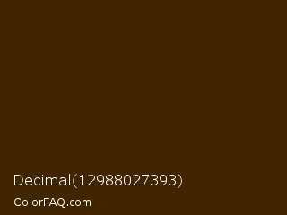 Decimal 12988027393 Color is a very dark orange color and the nearest color is Cola #3f2500. Hex code #412501 and RGB value is rgb(65,37,1). In RGB color space, this color is composed of 25% red, 15% green, 0% blue, In CMYK color space, this color is composed of 0% cyan, 43% magenta, 98% yellow , 75% black , In HSL color space, this color has a hue angle of 34° , 97% saturation and 13% lightness.