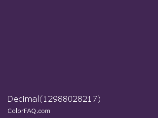 Decimal 12988028217 Color is a dark purple color and the nearest color is Deep Grape #381a51. Hex code #412653 and RGB value is rgb(65,38,83). In RGB color space, this color is composed of 25% red, 15% green, 33% blue, In CMYK color space, this color is composed of 22% cyan, 54% magenta, 0% yellow , 67% black , In HSL color space, this color has a hue angle of 276° , 37% saturation and 24% lightness.