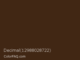 Decimal 12988028722 Color is a very dark orange color and the nearest color is Deep Oak #412010. Hex code #412714 and RGB value is rgb(65,39,20). In RGB color space, this color is composed of 25% red, 15% green, 8% blue, In CMYK color space, this color is composed of 0% cyan, 40% magenta, 69% yellow , 75% black , In HSL color space, this color has a hue angle of 25° , 53% saturation and 17% lightness.