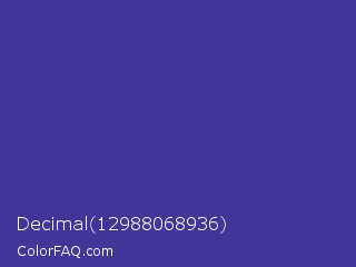 Decimal 12988068936 Color is a normal indigo color and the nearest color is Blue Pigment #333399. Hex code #413598 and RGB value is rgb(65,53,152). In RGB color space, this color is composed of 25% red, 21% green, 60% blue, In CMYK color space, this color is composed of 57% cyan, 65% magenta, 0% yellow , 40% black , In HSL color space, this color has a hue angle of 247° , 48% saturation and 40% lightness.