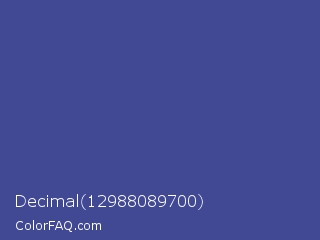 Decimal 12988089700 Color is a normal blue color and the nearest color is Chambray #354e8c. Hex code #414994 and RGB value is rgb(65,73,148). In RGB color space, this color is composed of 25% red, 29% green, 58% blue, In CMYK color space, this color is composed of 56% cyan, 51% magenta, 0% yellow , 42% black , In HSL color space, this color has a hue angle of 234° , 39% saturation and 42% lightness.