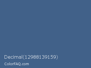 Decimal 12988139159 Color is a normal blue color and the nearest color is Queen Blue #436b95. Hex code #416189 and RGB value is rgb(65,97,137). In RGB color space, this color is composed of 25% red, 38% green, 54% blue, In CMYK color space, this color is composed of 53% cyan, 29% magenta, 0% yellow , 46% black , In HSL color space, this color has a hue angle of 213° , 36% saturation and 40% lightness.