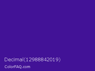 Decimal 12988842019 Color is a normal violet color and the nearest color is Pixie Powder #391285. Hex code #421297 and RGB value is rgb(66,18,151). In RGB color space, this color is composed of 26% red, 7% green, 59% blue, In CMYK color space, this color is composed of 56% cyan, 88% magenta, 0% yellow , 41% black , In HSL color space, this color has a hue angle of 262° , 79% saturation and 33% lightness.