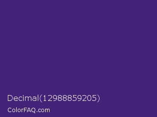 Decimal 12988859205 Color is a normal violet color and the nearest color is Meteorite #3c1f76. Hex code #422379 and RGB value is rgb(66,35,121). In RGB color space, this color is composed of 26% red, 14% green, 47% blue, In CMYK color space, this color is composed of 45% cyan, 71% magenta, 0% yellow , 53% black , In HSL color space, this color has a hue angle of 262° , 55% saturation and 31% lightness.