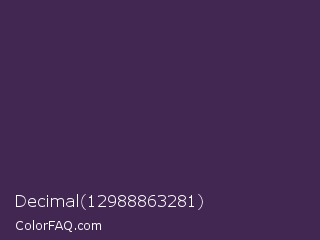 Decimal 12988863281 Color is a dark purple color and the nearest color is Bossanova #4e2a5a. Hex code #422753 and RGB value is rgb(66,39,83). In RGB color space, this color is composed of 26% red, 15% green, 33% blue, In CMYK color space, this color is composed of 20% cyan, 53% magenta, 0% yellow , 67% black , In HSL color space, this color has a hue angle of 277° , 36% saturation and 24% lightness.