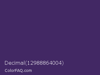 Decimal 12988864004 Color is a dark violet color and the nearest color is Jacarta #3a2a6a. Hex code #422864 and RGB value is rgb(66,40,100). In RGB color space, this color is composed of 26% red, 16% green, 39% blue, In CMYK color space, this color is composed of 34% cyan, 60% magenta, 0% yellow , 61% black , In HSL color space, this color has a hue angle of 266° , 43% saturation and 27% lightness.