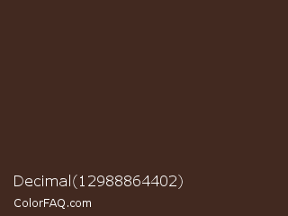 Decimal 12988864402 Color is a very dark orange color and the nearest color is Cork #40291d. Hex code #422920 and RGB value is rgb(66,41,32). In RGB color space, this color is composed of 26% red, 16% green, 13% blue, In CMYK color space, this color is composed of 0% cyan, 38% magenta, 52% yellow , 74% black , In HSL color space, this color has a hue angle of 16° , 35% saturation and 19% lightness.