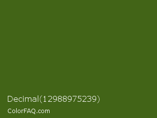 Decimal 12988975239 Color is a dark green color and the nearest color is Dell #396413. Hex code #426417 and RGB value is rgb(66,100,23). In RGB color space, this color is composed of 26% red, 39% green, 9% blue, In CMYK color space, this color is composed of 34% cyan, 0% magenta, 77% yellow , 61% black , In HSL color space, this color has a hue angle of 86° , 63% saturation and 24% lightness.