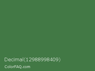 Decimal 12988998409 Color is a normal green color and the nearest color is Fern Green #4f7942. Hex code #427945 and RGB value is rgb(66,121,69). In RGB color space, this color is composed of 26% red, 47% green, 27% blue, In CMYK color space, this color is composed of 45% cyan, 0% magenta, 43% yellow , 53% black , In HSL color space, this color has a hue angle of 123° , 29% saturation and 37% lightness.