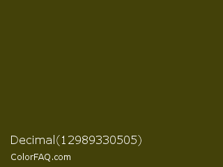 Decimal 12989330505 Color is a very dark yellow color and the nearest color is Bronze Olive #4e420c. Hex code #434109 and RGB value is rgb(67,65,9). In RGB color space, this color is composed of 26% red, 25% green, 4% blue, In CMYK color space, this color is composed of 0% cyan, 3% magenta, 87% yellow , 74% black , In HSL color space, this color has a hue angle of 58° , 76% saturation and 15% lightness.