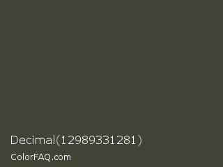 Decimal 12989331281 Color is a dark yellow color and the nearest color is Armadillo #433e37. Hex code #434237 and RGB value is rgb(67,66,55). In RGB color space, this color is composed of 26% red, 26% green, 22% blue, In CMYK color space, this color is composed of 0% cyan, 1% magenta, 18% yellow , 74% black , In HSL color space, this color has a hue angle of 55° , 10% saturation and 24% lightness.
